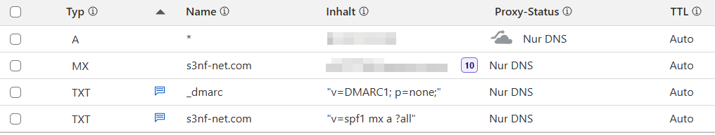 Folgend kommen denn die MX und TXT Records welche für die Mail-Situation noch relevant sind. Wie geschrieben wurden bei meiner Config alle Werte bereits automatisch seitens Cloudflare erkannt / übernommen.