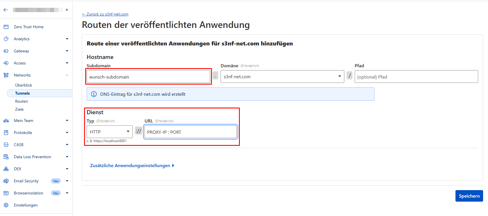 Den Webtraffic kannst du nun mit CNAME-Records auf deinen Tunnel legen. Entweder direkt hier in den DNS Einstellungen oder besser über die Cloudflare Zero-Trust Tunnel Konfiguration.